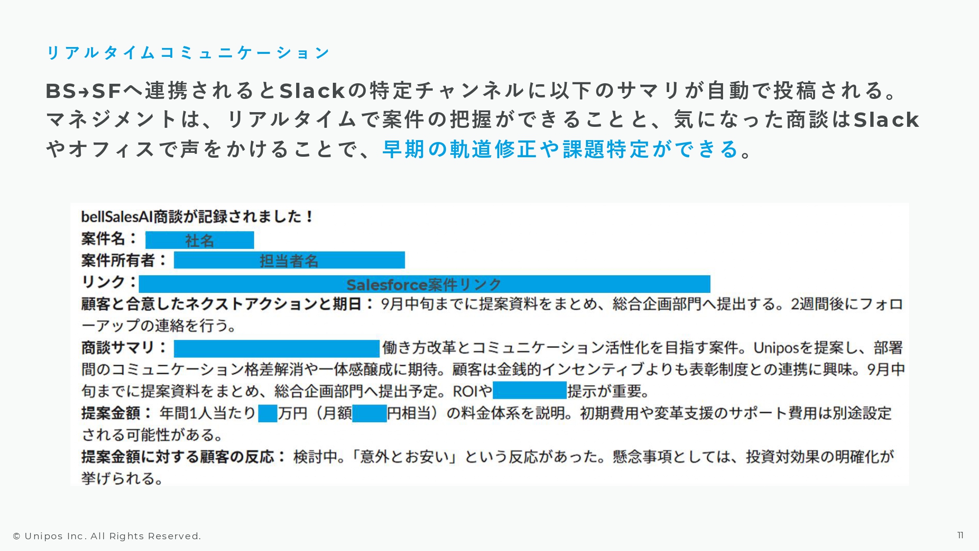 - 情報連携コストの低下:Slack×Salesforce×要約で部門間連携が円滑に。