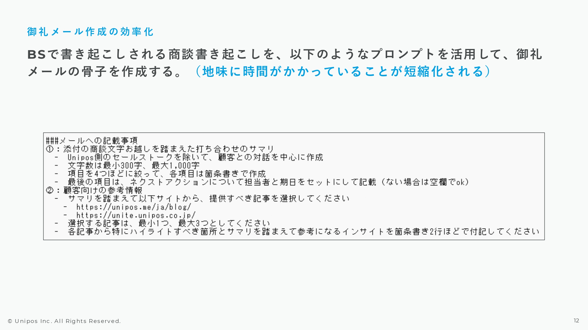 商談終了後、録音データの文字起こしをプロンプトに貼り付けて御礼メールを生成する仕組みを導入。これにより、従来10分以上かかっていたメール作成が約5分で完了できるようになりました。