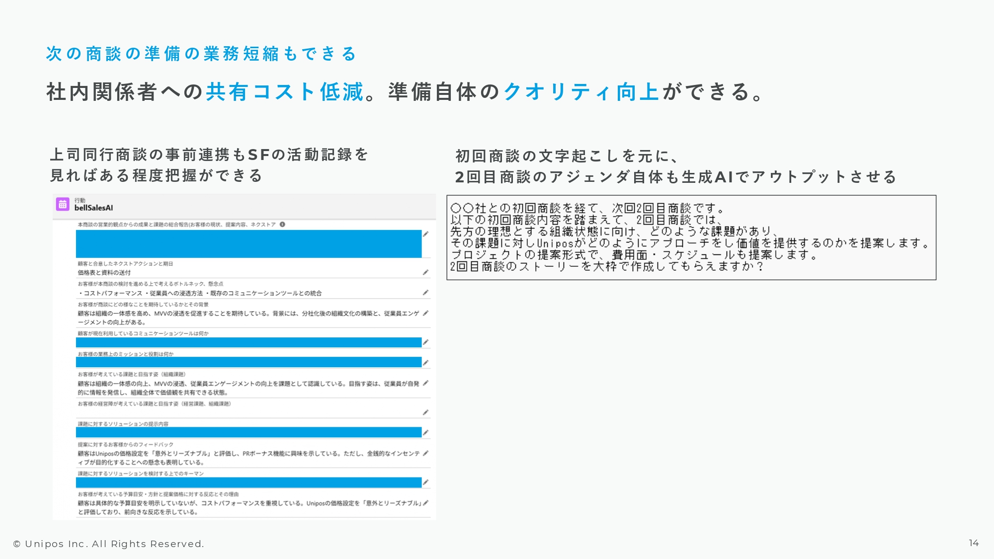 今回のウェビナーに登壇いただいたUnipos社の事例は、bellSalesAIが単なる工数削減ツールではなく、営業活動全体を底上げする基盤になり得ることを示していました。