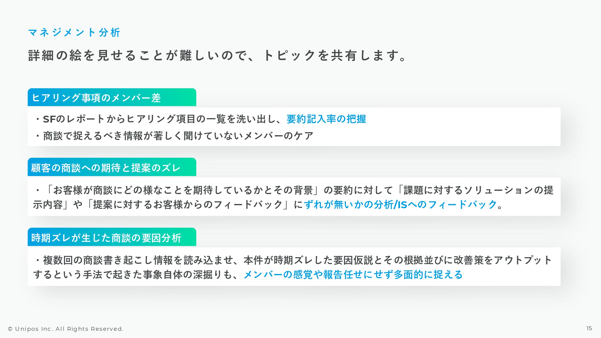また、「顧客の期待」と「提案内容」「フィードバック」の整合性を確認することで、ズレを早期に是正。さらに、複数回の商談ログをまとめて分析し、案件が時期ずれした要因仮説を導くなど、定性情報を活用したマネジメントサイクルを実現しています。